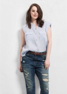 The youth option is a linen short-sleeve blouse with jeans. It looks fun and relaxed. In this outfit, it will be convenient for you to go shopping and take a walk with friends. For a more effective image, a blouse is chosen with a pattern or embroidery.