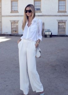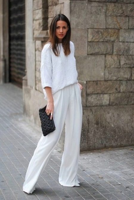 White color is a symbol of purity and freedom. A light, spacious white linen blouse with wide white trousers and white sandals will make you irresistible. A light, comfortable and romantic look is perfect for both work and date. Stylish touch - black quilted clutch.