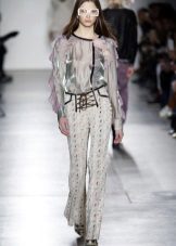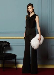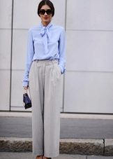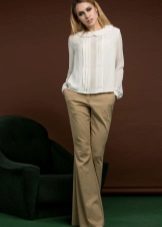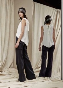 If you want to look stylish at meetings with friends, then flared cut trousers are suitable for a white silk blouse, while the top can be decorated with various elements - ruffles, frills, shuttlecocks. Complement this look with black high-heeled shoes and a trendy clutch.