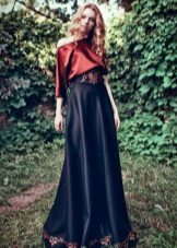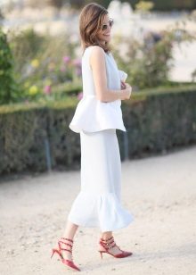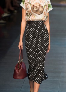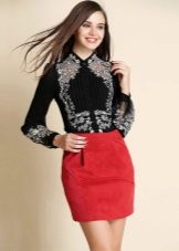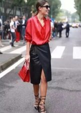 A silk black blouse in white peas of a free cut goes well with a scarlet pencil skirt. Graceful black stiletto heels will successfully complete your fashionable look.