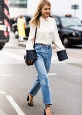 A snow-white sleeveless blouse with discreet buttons is in perfect harmony with tight blue jeans. This outfit is perfect for a stylish everyday look. A black blouse with a loose fit and long sleeves can be worn with white jeans. To emphasize the waistline, the blouse should be tucked into jeans.