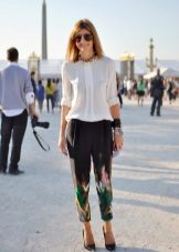 The combination of white and black is ideal for embodying a strict look in a business style. Black dress pants look beautiful with a snow-white blouse of a man's cut.