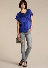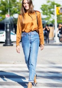 A tandem of a silk blouse of a free cut with narrowed trousers or a pencil skirt looks beautiful. Short girls prefer V-neck blouses with straight jeans.
