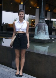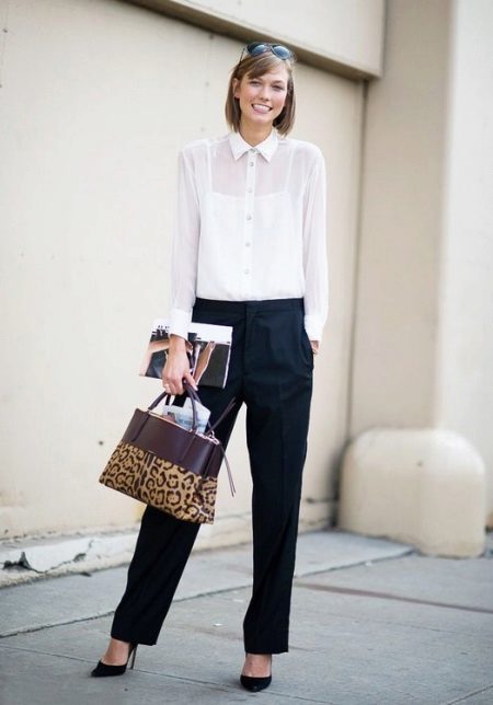 Black straight trousers and a white see-through blouse will help to create a classic. Heeled pumps and a leather print bag will complement your look.
