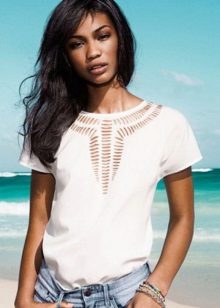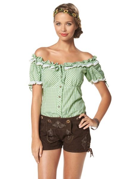 A blouse top is a type of sportswear. It can be with a short sleeve or without it. Tops with open shoulders are relevant when creating a youth bow.