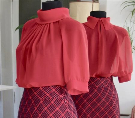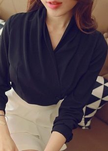 Such a blouse favorably emphasizes your chest and neckline due to the fact that one edge goes on the other. This forms a V-shaped neck. Such models can be made of various textures combined with each other. Blouses in which the right and left shelves are made in contrasting colors look especially impressive.