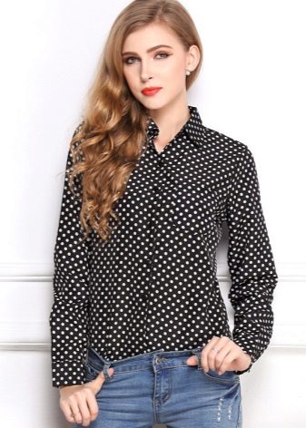 This model from the classic blouse is distinguished by the presence of a shelf with buttons, a stitched sleeve and a collar. Such blouses can be made not only from plain fabrics, but also with polka dot prints, geometric shapes or stripes.