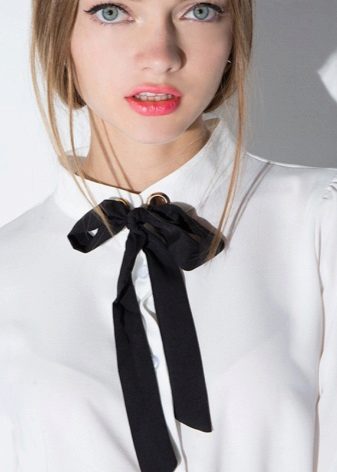 Classics of the genre by Coco Chanel. It was Coco who made the bow blouse an elegant element of the basic wardrobe. A bow can be in one color palette with the main product, and can be made in another color. Especially relevant are the models where the bow is made of contrasting materials.