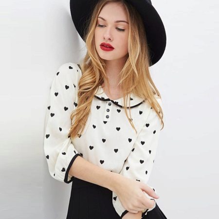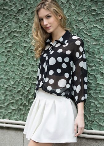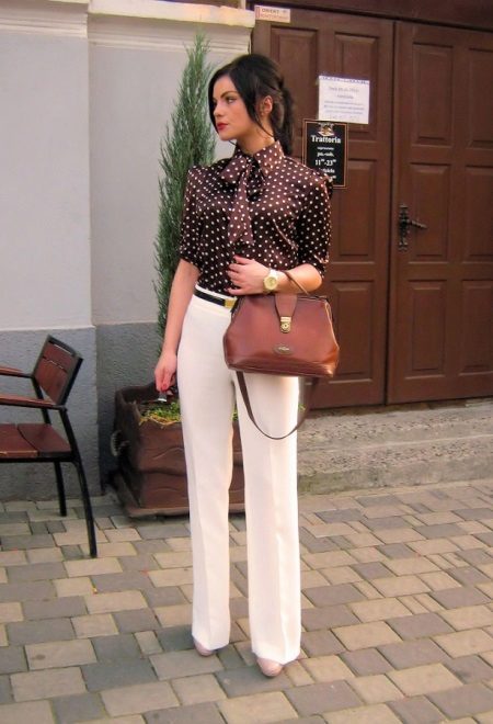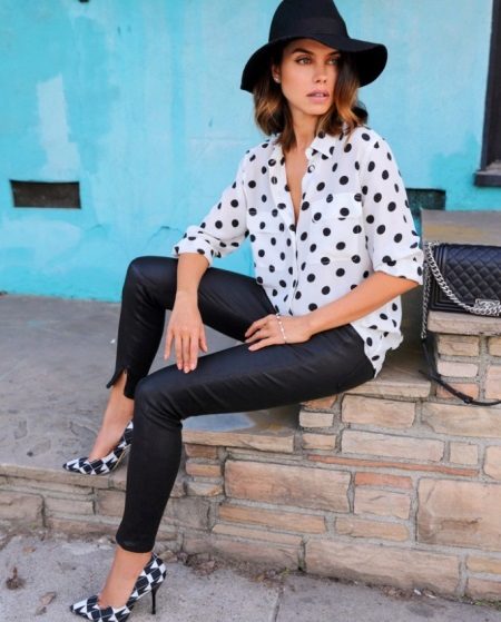 The black polka dot pillow print looks amazing on a white blouse. Combine such a blouse with green trousers and beige shoes with a bow. As accessories, choose metallic bracelets or watches.