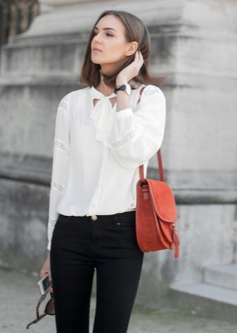 Lace trim on the blouse will make your look romantic. Most often, lace is used in retro style. Such decor is not acceptable for office bow.