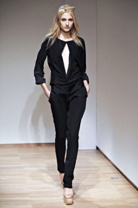 Classic black is becoming a leader among other color schemes. Fashion designers choose it as the color of the main product, for example a black chiffon blouse with a deep oval neckline. Black can be combined with white. Moreover, it is found not only in the decor of the main product, but also in prints.