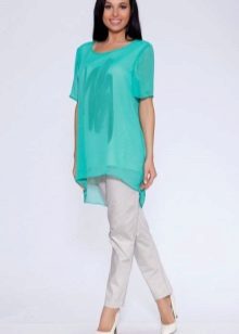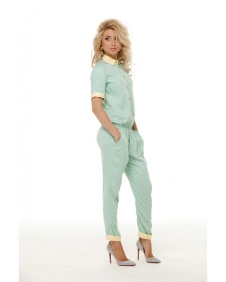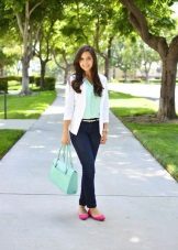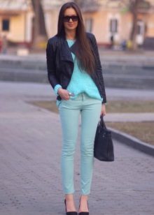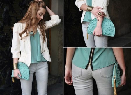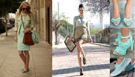 Shades of mint color are in perfect harmony with clothes of light yellow or blue color. It can be a blue skirt or yellow trousers. Supplement a set of shoes or sandals, matched to match the clothes.