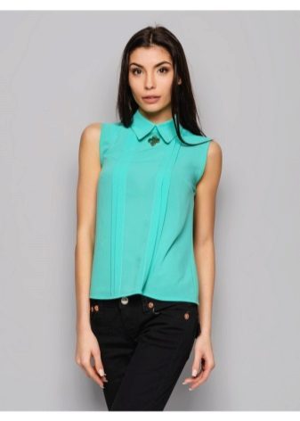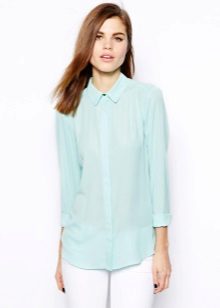 A strict, classic pale mint blouse with a button placket, a turn-down collar and long sleeves will help refresh a business suit.
