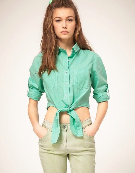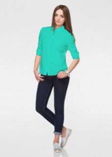 A blouse of a shirt cut of saturated mint color is perfectly combined with skirts of different styles from denim and jeans. You can choose a jeans vest for them, and wear moccasins, ballet shoes or slip-on shoes as shoes.