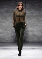 - Strict gray pants with a transparent blouse in saturated color with a small bow.