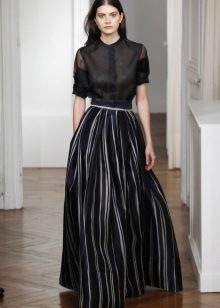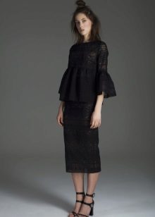 - A delicate black blouse with an elegant frill along the line of buttons with a classic cut skirt.