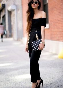 If you want an incredibly stylish and unbreakable combination, wear an off-shoulder blouse with overalls. It will be good for everyday looks in combination with sneakers, and for a fashionable party, complemented by sandals or high-heeled boats.