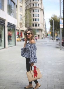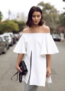Blouses with sleeves and open shoulders have become an indisputable hit of the current season. They can be made in the form of a shirt or blouse, which seemed to have cut off the upper part. This model looks very sexy, but at the same time has a certain severity, so it is suitable for everyday looks.