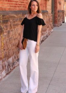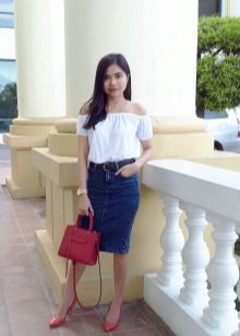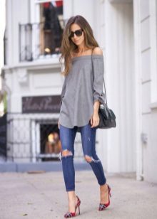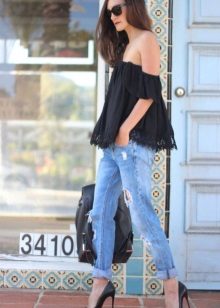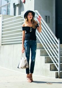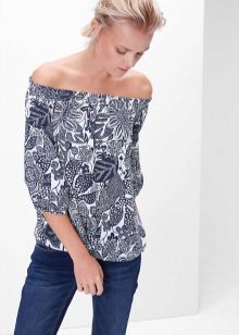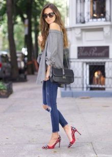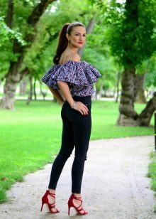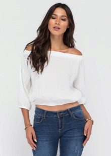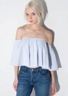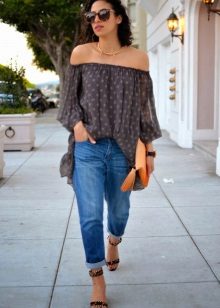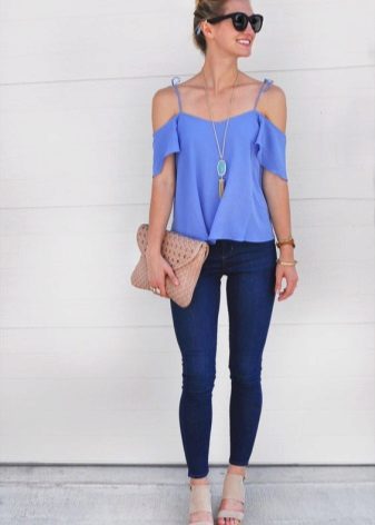 Jeans have long become a universal item of women's wardrobe, so you can wear them with absolutely any clothing. A blouse with bare shoulders was no exception. Since she will always be the main focus of the image, just wear it with your favorite jeans. It is desirable that they be simple and concise.