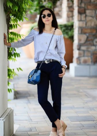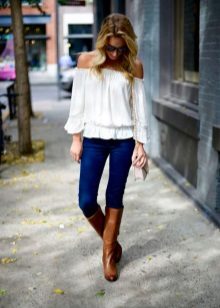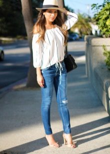 The fashion trend in the form of open shoulders looks most elegant in such a modest embodiment. A simple elongated white blouse, blue skinny, light boats and a small handbag on a chain. Nothing more, everything blends perfectly with each other, creating a magnificent image.