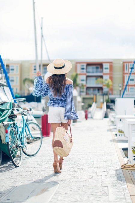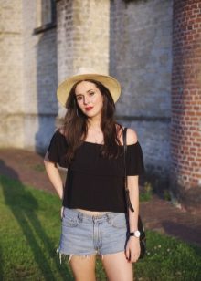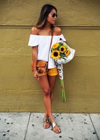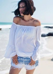 There is nothing more feminine than a bell sleeve combined with bare shoulders. This image is perfect for summer, as it allows you to emphasize your tan and flawless figure. A voluminous peasant blouse goes well with modest white shorts and beige boats. This look looks really summer, thanks to a straw bag and a straw hat. An ideal solution for walking along the seafront promenade of the sea resort, but also suitable for urban everyday life.