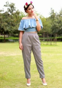If you are going to work or study, it is best to wear such a blouse with stylish trousers. So the image will look modestly modest, but stylish. Choose culottes, skinny or classic.