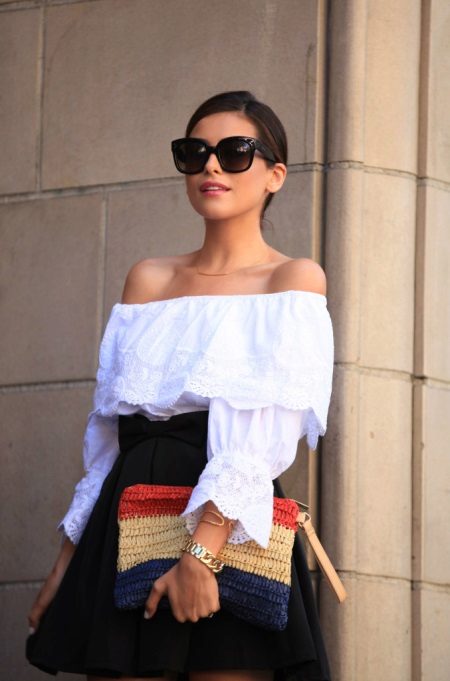 Without much effort, the classic black-and-white look turns into a stylish and interesting one. Airy blouse in the style of "Carmen", a lush mini-skirt with a bow and a three-color straw clutch. It looks just stunning! Great idea for a date, a cocktail with friends and other special occasions.
