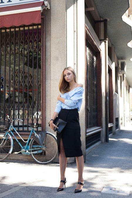 Another image with a skirt, which is a clear example of how to wear a blouse with bare shoulders in the office. Complement it with a black wrap pencil skirt, black pumps and a small clutch. Get a business but very stylish look.
