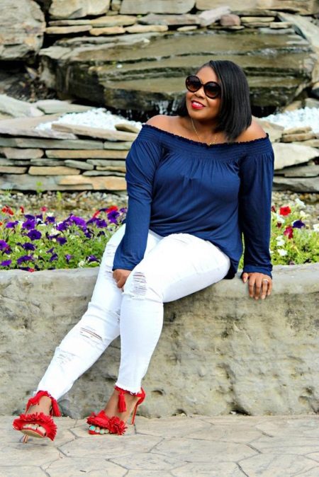Who says off-shoulder blouses are just for thin people? Girls with forms can also choose the appropriate option. The main thing is that the shoulders are bare in moderation, and full arms and waist are hidden by a voluminous blouse with a long sleeve. White jeans and red high-heeled sandals complement the look. It looks amazing!