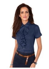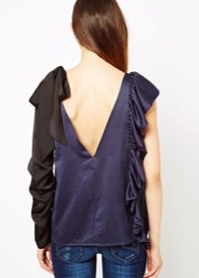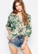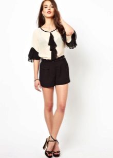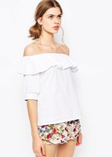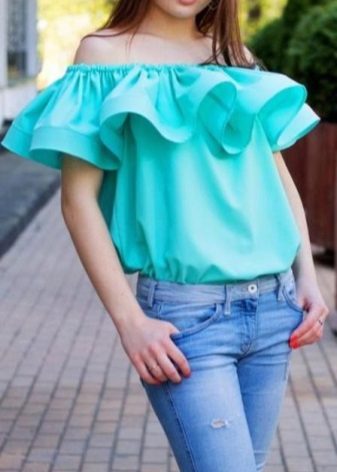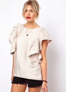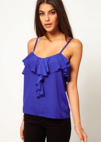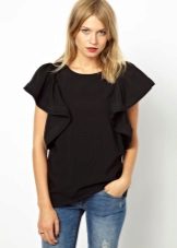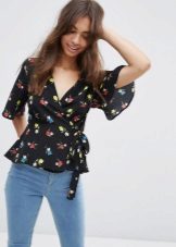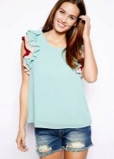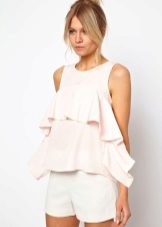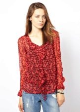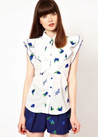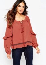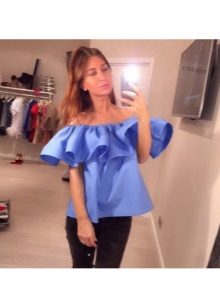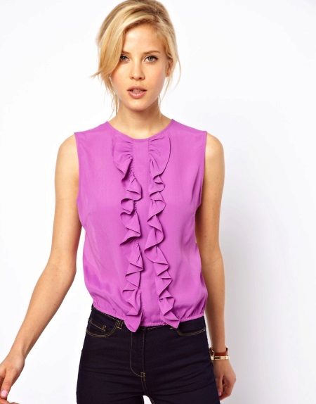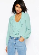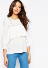 Many blouse models with this decor can be worn with jeans, and summer options look good with denim shorts. In cool weather, you can add a jacket, cardigan or cardigan to an ensemble with a blouse trimmed with flounces.