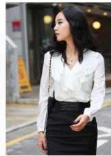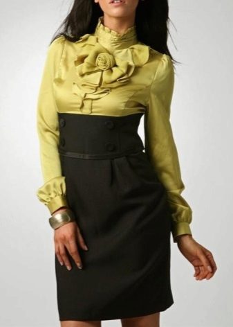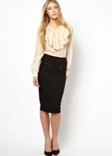 You can create a stylish business look from a strict blouse with frill on the chest and high-waist pencil skirts. The combination of a white blouse with a gray skirt also looks quite strict.