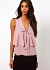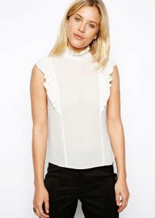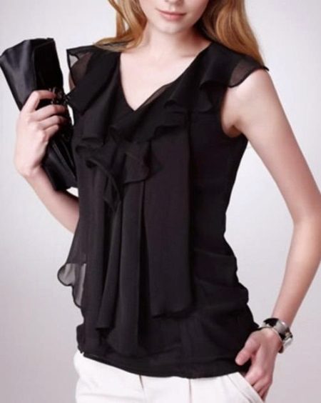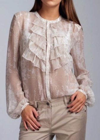 A light blouse with a flounce made of translucent fabric looks good with light trousers and black pants.
