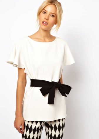 A black silk blouse with frills looks very elegant with white trousers.