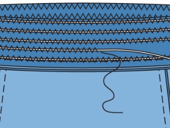 - Iron the allowances on the drawstring inside out, in short and longitudinal sections. Pin the strip from the inside, aligning all the edges, stitch according to the marking.