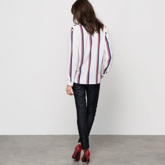 A blouse with a swing collar - with drapery in the chest area - has long been one of the most sophisticated options for women. She emphasizes the line of the neck and the neckline, emphasizing the head - so you should take care, in addition to the blouse, about the hair and makeup.