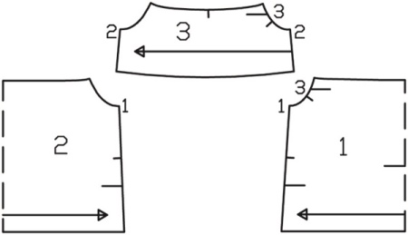 - From the point of 1.5 cm, measured earlier in the construction of the neck, through point 2, indicated when marking the shoulder inclination, draw a segment that is the sum of the length of the shoulder (t. 14) and another 1 cm (taken into account for proper fit). The result was a shoulder cut line.