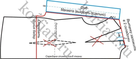 - A new cut line for the sleeve when connecting the shoulder point and the side point of the blouse.In addition to it, you need to draw a cuff 8 cm wide (after stitching it will be half as much). Cut it off and close separately.