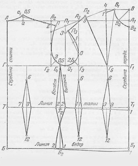 - Dividing the segments O-G2 and O2-G3 into 4 identical segments, additional marks are obtained for constructing straight shoulder girdles and armholes.