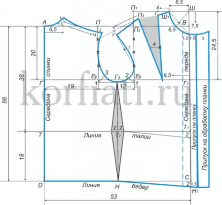 - From the end of 8.5, marked during the construction of the neck, and the points R1, measure 1.5 cm to the right and combine the calculated points. Extending it by 1 cm up, combine it with a point of 8.5. Add 3 cm to the clasp. The length from the waist to the bottom is taken from 12 to 18 cm, depending on preference.