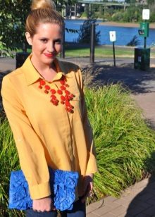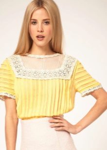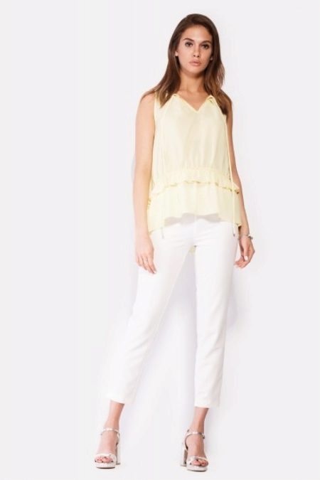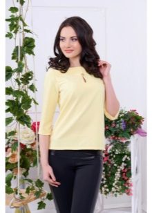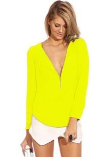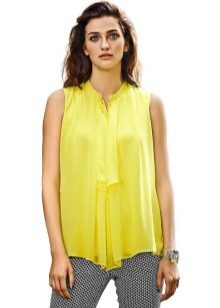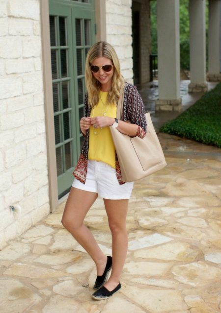 A combination of a yellow blouse and shorts deserves special attention. Shorts can be of various lengths. For a more effective look, fill in a stylish blouse in shorts or roll up your sleeves.