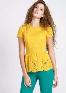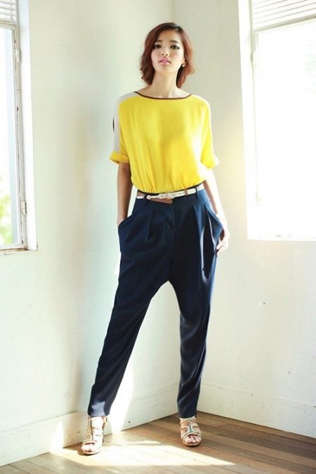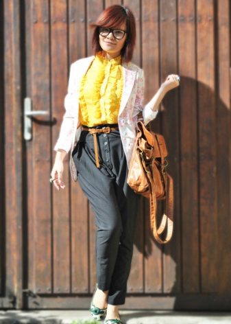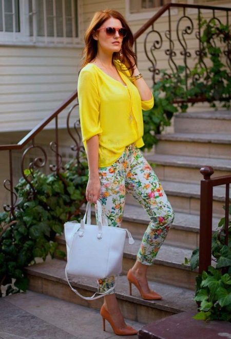 - Pants do not have to be very simple, they can be with a print, for example, floral. The idea is to combine one of the colors in the print with a yellow top.