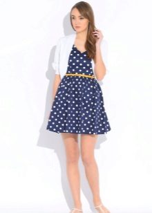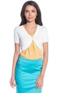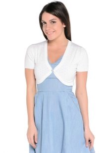 At the mention of the bolero, the first combination that comes to mind is a dress. This combination is suitable for all occasions, is appropriate in any style and is a lifesaver for many women. Dress + bolero is, first of all, an evening option, and only then there are working images, everyday bows and urban style. White bolero can also be combined with a short dress, corset, skirt and trousers.