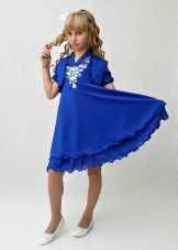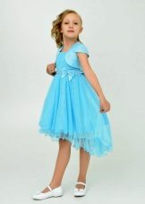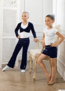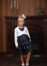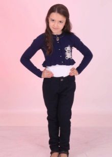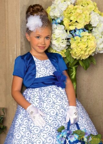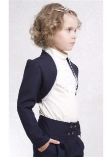 - elegant sophistication - an unusually elegant blue suit, consisting of a bolero with round shelves trimmed with white lace, a white turtleneck and pants with a wide belt on buttons: this model is suitable for girls of all ages, from 5 to 80 years.