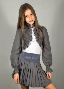 - elegant severity - a gray set of bolero with gathered sleeves and ribbed skirt and pleated skirt on a wide belt of muted blue with a white blouse: and a school outfit can be stylish;