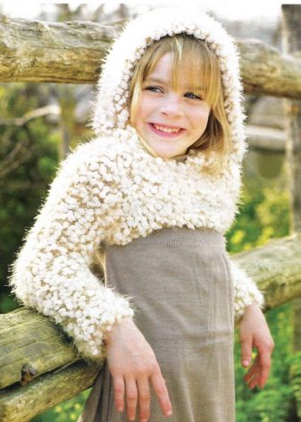- a cozy "grass" for a little prankster - a fluffy bolero with a hood made of fancy yarn: original and warm;