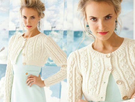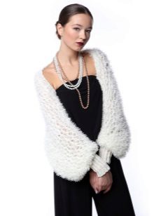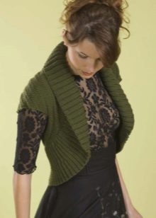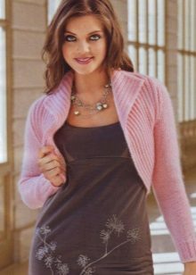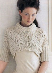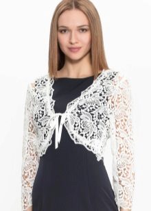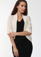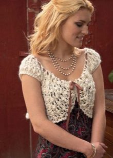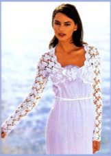 Knitted patterns, implying large "gaps" in the pattern, are well suited to the dress - they do not warm too much, but add completeness along with it. Depending on the material from which it is made, such a bolero will decorate both a sundress and an evening toilet.