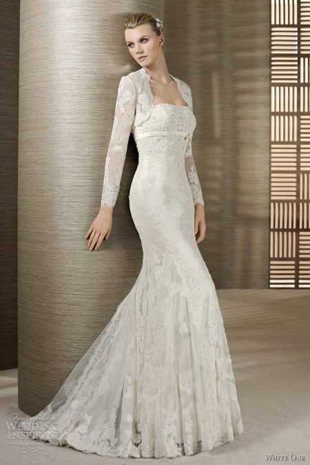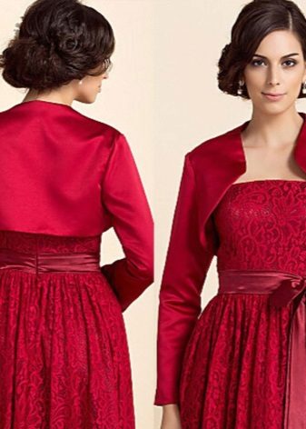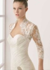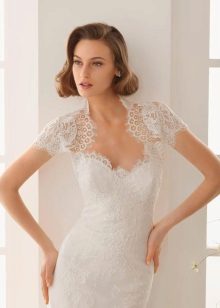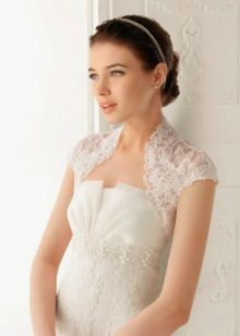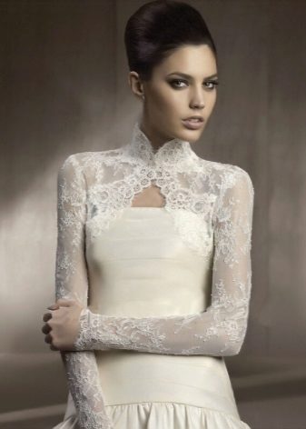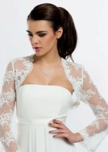 - An ultra-short bolero with a long sleeve in the color of a dress with a lace pattern repeating the motif of the dress is ideal for a long dress with open shoulders and back, a fluffy skirt with a small train in the style of a “little mermaid” or “fish”. Since this dress fits the figure to the middle of the thigh, such a bolero model will make the top of the outfit elegant and not elaborate, focuses on a slender waist and hips, visually enlarges the bust and lengthens the growth.The openwork edges of the shelves of the bolero smoothly round at the neckline, which makes the image more romantic and tender. The dress is decorated with lace along the entire length, the bodice is embroidered with beads and beads, a thin ribbon effectively emphasizes the high and thin waist. To this, a minimum of jewelry is required, the hairstyle is highly raised or smooth.