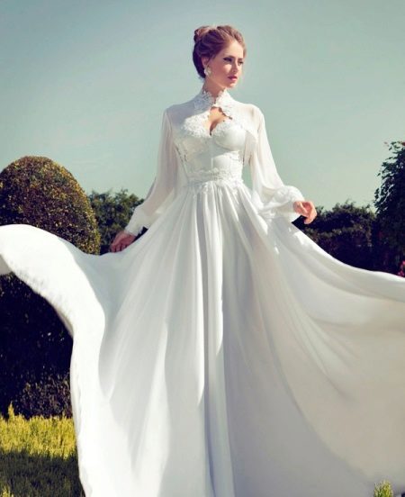 - A vintage long dress made of flying flowing fabric with a fitted bodice and a sun skirt will make any bride fabulous. The bodice is corset, decorated with thin lace, which also focuses on the waist in the form of a belt. A bolero with a collar in the form of a small stand with a fastener on the neck and a long sleeve-flashlight on the cuff will fit this dress. The edge of the bolero is decorated with the same lace as on the dress. Such a bolero model gives the image airiness and lightness, tenderness and chic. The outfit will be complemented by a high hairstyle and large vintage earrings.