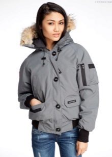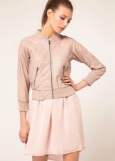 - Short bomber ending at the waist will look great on a slender girl with a pronounced waist and hips. An excellent combination for him will be a short skirt with high waist, a blouse and shoes.