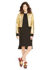 - Gold color bomber jacket able to emphasize the glamor of the onion as a whole, it should only be borne in mind that there should not be too much gold, as well as shiny things in general. Of course, for a model made in such a non-standard color, you need to choose the most calm things in terms of colors - pants or a skirt, blouse or t-shirt, shoes or sneakers.